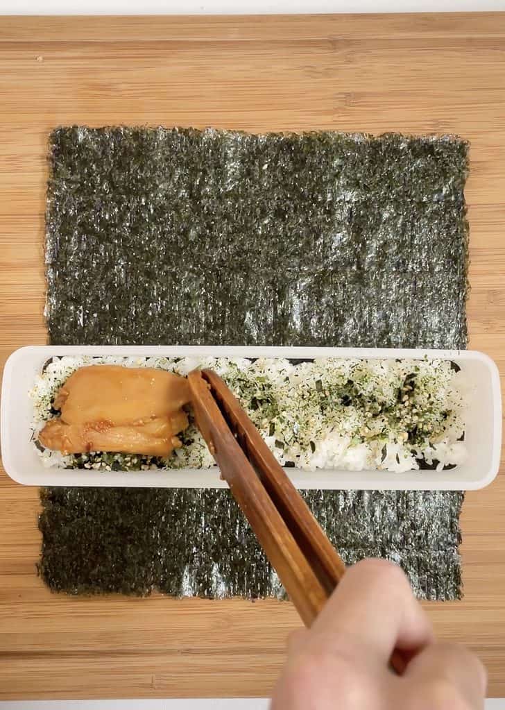 - Use the musubi press and press down all the layers of rice and chicken. Slowly lift the mold off of the nori sheet while holding the musubi press. You’re left with a perfect rectangular shape of rice and chicken in layers.