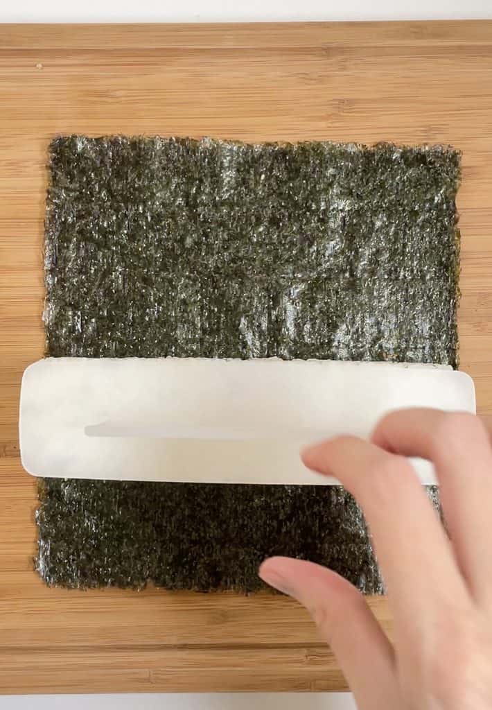 - Place musubi mold on top at ⅔ of the nori sheet.