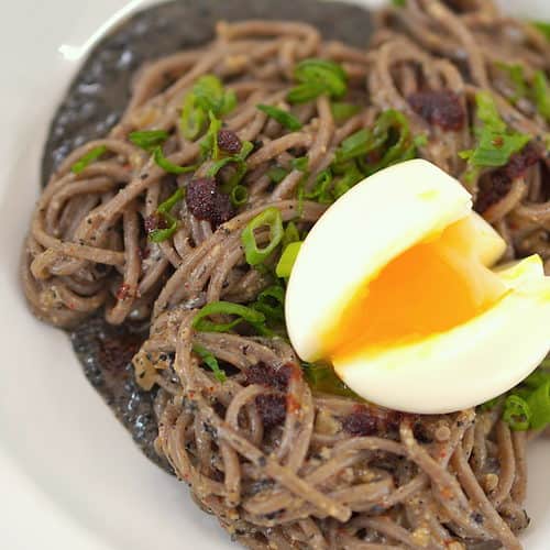 In another bowl, add the cooked noodles together with black sesame paste and, the sauce. Toss to coat the noodles. The sauce proportion will depend on how much your noodles are.